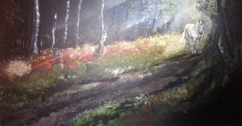 "In the forest" met de hand, zonder penselen, geschilderd. Een vroege zomermorgen na een zwoele nacht. De damp is net verdwenen en het licht maakt zijn intrede.
