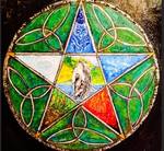 2016Schild met de vijf elementen. Verwerkt in Keltische motieven. Met de eenhoorn in het centrum. Hij doopt zijn hoorn in het water; een symbool voor ontgiften.